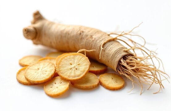 American Ginseng root with thin slices on white background. Herbal medicine ingredient used in traditional Chinese practices for wellness and vitality.