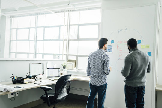 Businessmen using whiteboard in office