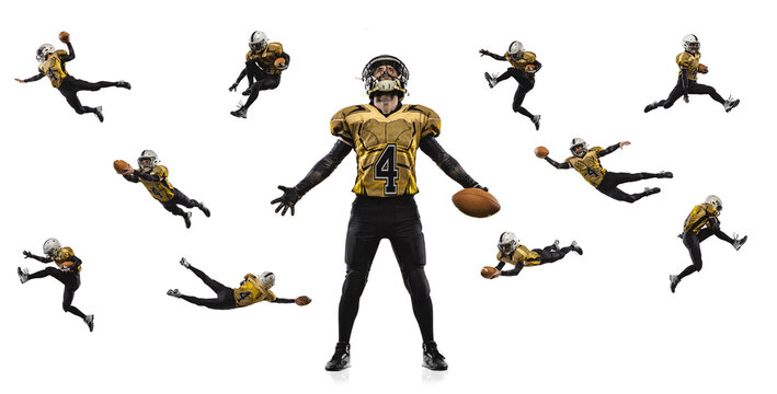 Full-length horizontal portrait of professional american footbal player training isolated over white background. Collage