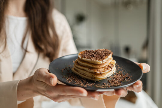 Woman holding plate with heart shaped pancakes with grated chocolate