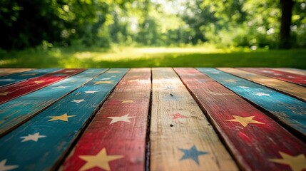 Vibrant Rustic Table with American Flag Pattern in Serene Outdoor Setting