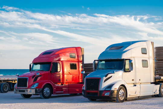 Transport concept. Road freight cars. rucking with semitruck vehicle. Semi truck in America. Freightliner trailer transportation. Rig truck semi trailer. Semitrailer on the road. American style truck
