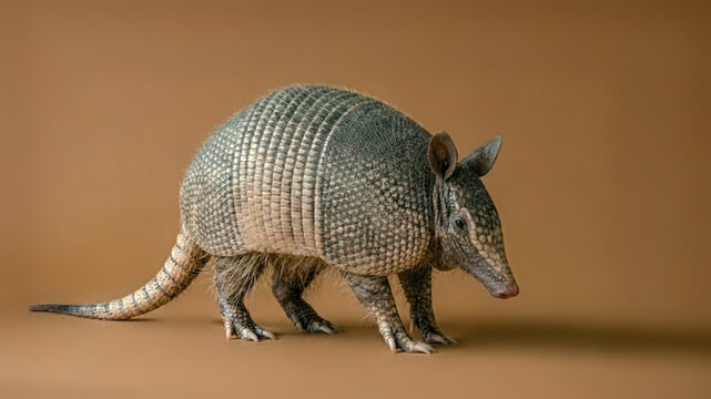 A minimalist composition of an armadillo. An animal with armored, bony plates, strong digging claws, and a sharp sense of smell. Food source: ants, termites, and grubs.