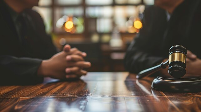 ConflictResolutionA gavel rests on a polished table, symbolizing mediation, with blurred figures in the background engaged in serious discussion, suggesting a quest for amicable solutions.