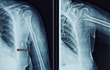 Film X ray shoulder show Hill-Sachs lesion. Hill Sachs lesion is posterolateral humeral head compression fracture from impaction on glenoid rim after shoulder is dislocated. Medical imaging concept