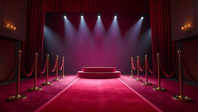 tunicle. Empty award podium on red carpet with velvet ropes, ceremonial space with soft lighting. event programs, museum guides, designed for cultural heritage projects and event programs.