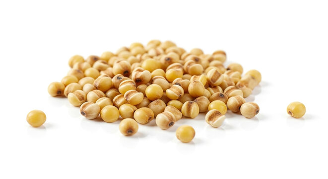 Heap of dried soy beans isolated on white background, showcasing the texture and color of this versatile legume used in various food products