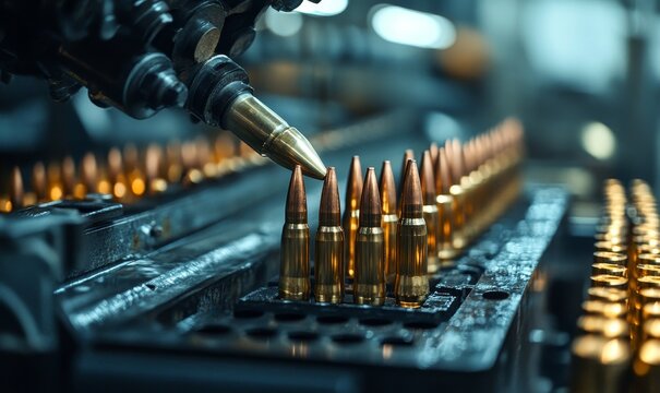 Ammunition Production Line in Factory. Close-up of bullets on an ammunition production line, highlighting the precision and automation in a munitions factory.