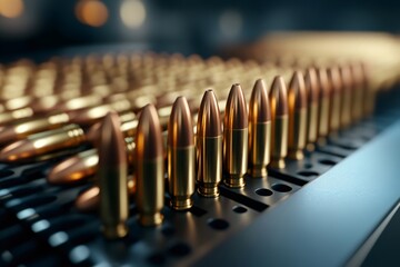 creative composition of bullets on table with blurred industrial background, showcasing metallic textures and focus on ammunition