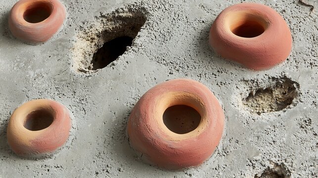 Asymmetrical blobs matte clay red and ochre resembling amoebae on a weathered concrete gray background
