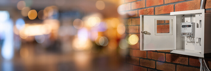 Two smart electric power meter counter measuring power usage.Banner,advertisement.Close-up of modern smart grid residential digital power supply meter.Indoors shot.Selective focus.
