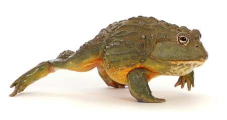 African bullfrog (Pyxicephalus adspersus), walking.  Captive, occurs in AFrica.