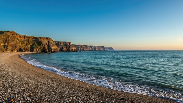 Sharp cliffs lining the coast under a cloudless blue sky