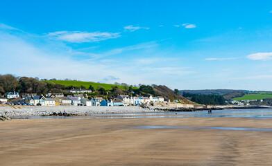 View of Amroth Beach on the Pembrokeshire coast in winter with very few people. It is more popular in the summer with families enjoying the sea and sand.