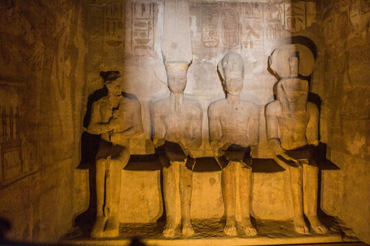 Statues of Ptah, Amun Ra, king Ramesses II and Ra-Horakhty illuminated by the rays of the sun in the Great Temple of Ramesses II  in Abu Simbel, Egypt. This phenomenon occurs only two times a year.