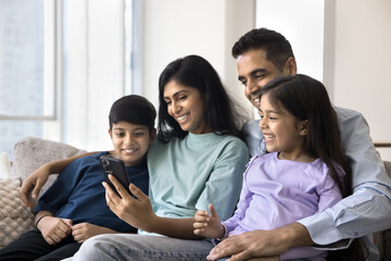 Smiling Indian family of four, father, mother and their two little son and daughter sitting on sofa, enjoying new mobile application usage, watching online educational amusing content on smartphone