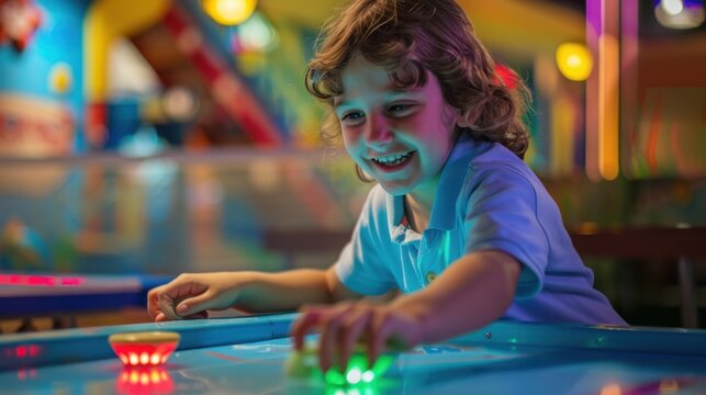 Teenage boy having fun at entertainment games arcade playing amusement center machines