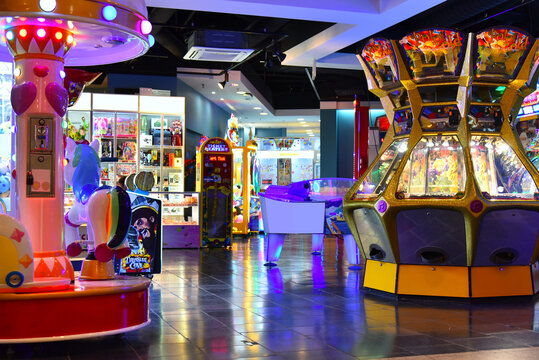 Play fun area for gamer with various bright colorful attractions and slot machines