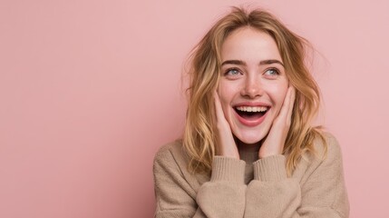 isolated shot of joyful blonde young cute woman laughs joyfully as hears funny anecdote from friend has long light hair poses against pink studio wall happiness and positive emotions concept no logos