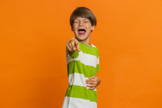 Happy Caucasian young man laughing out loud after hearing ridiculous anecdote, reaction on funny joke, feeling carefree amused. Positive people. Guy isolated on studio orange background. Copy-space