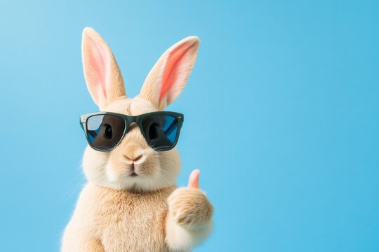 Funny easter bunny rabbit wearing sunglasses gives thumbs up on a blue background ready for a cheerful celebration and fun