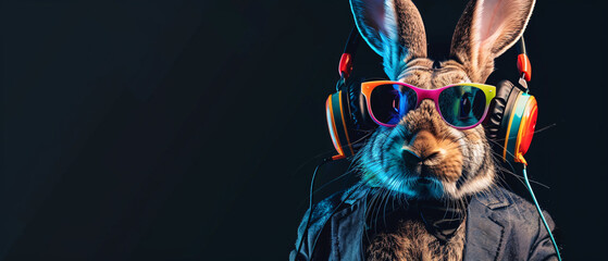 Cool rabbit wearing headphones and sunglasses