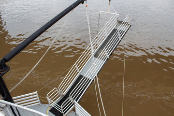 Industrial climber climbs up the stairs to the roof. worker in harnesses for working at heights climbs onto the roof. copy space for your text