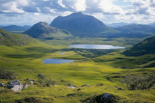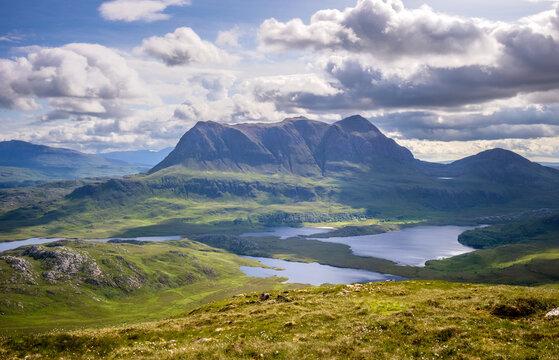 Scenic View of Cul Mor and An Laogh from Stac Pollaidh with Loch an Doire Dhuibh Under Dramatic Clouds in the Scottish Highlands on a Sunny Summer Day