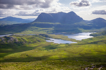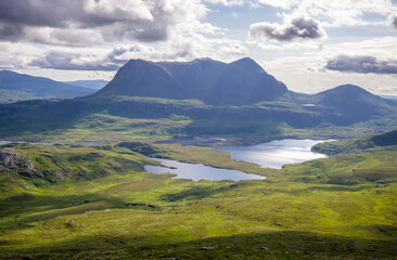 Scenic Views of Cul Mor and An Laogh from Stac Pollaidh in Scottish Highlands with Loch an Doire Dhuibh and Dramatic Clouds on a Sunny Day