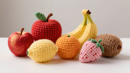 Colorful collection of handmade crocheted fruits including apple, banana, lemon, orange, strawberry and kiwi isolated on white background.