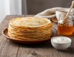 A stack of golden pancakes on a wooden table. Accompanied by a jar of honey and a small bowl of cream. A cozy breakfast setting.