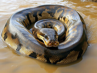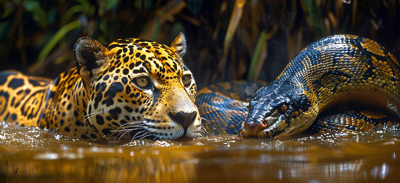 Closeup of an anaconda snake wrapped around an alligator in a pond in Pantanal, Brazil