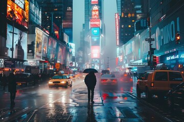 street of modern city with taxis and skyscrapers in grainy gradient, noise effect, vintage aesthetic, analog feel,  retro, nostalgic concept.