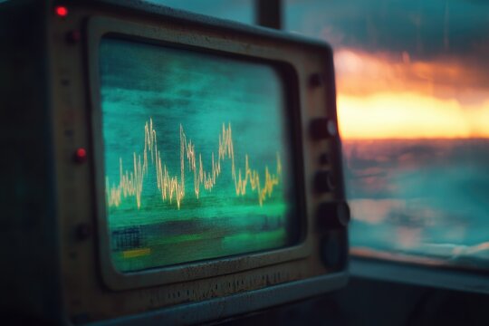 Vintage oscilloscope displays a waveform against a dramatic sunset backdrop.