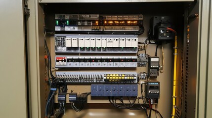 An electrical panel with multiple circuit breakers, switches, and other electrical components.