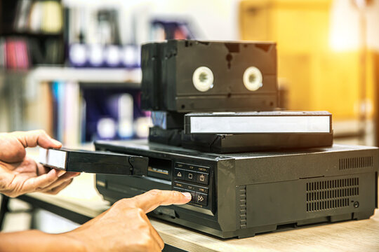 Close-up hand chooses and put or insert video cassette tape VHS on video tape player concept of vintage electric retro style and electronic appliances multimedia player device old fashioned.