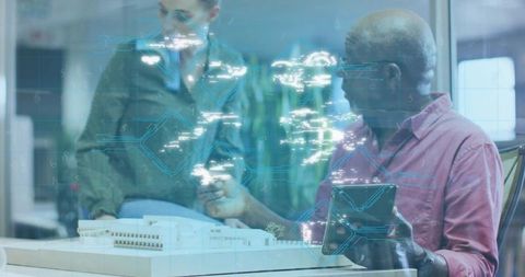 Architect analyzing scale model amidst binary overlay in modern workspace