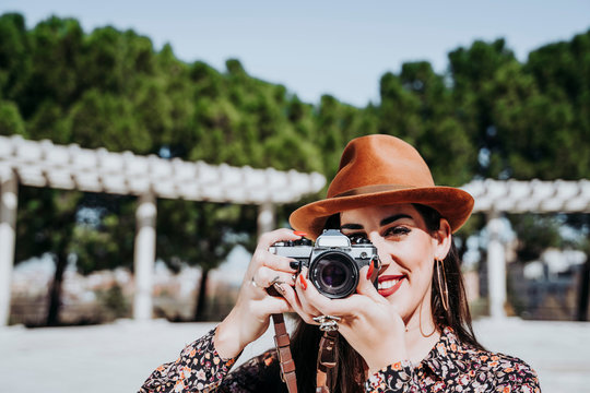 Smiling young woman using a camera to take photo.