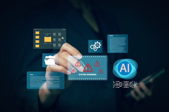 Artificial intelligence notification in healthcare, medical warning technology, and digital safety concepts. Doctor holding smartphone with holographic AI chip icon and warning alert.