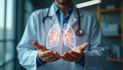 Doctor holds hologram of human lungs for diagnosis. Futuristic tech, digital 3D anatomy, respiratory system exam, modern treatment. Pro pulmologist analyses organ, glows in blue network connection,