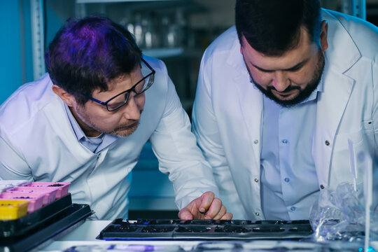 Medium shot highlighting a data analysts pointer on cyber tactic charts on a purple backlit collaboration wall with team members blurred around.