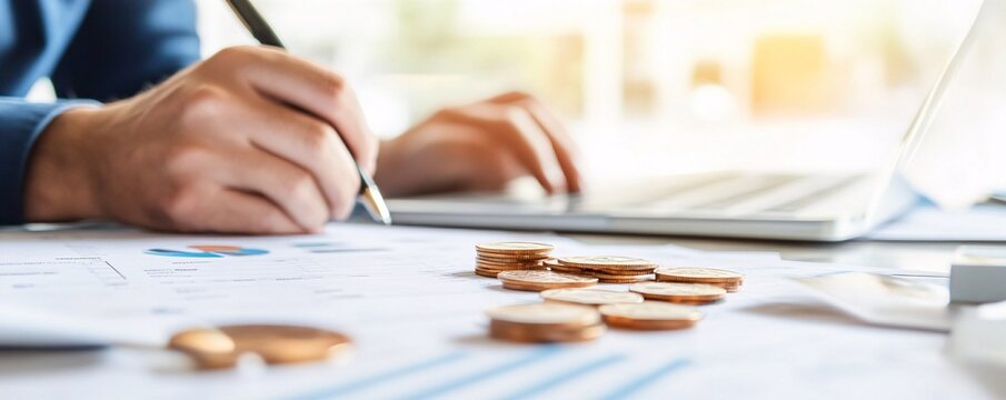 Businessman reading data in bar graph and pie chart form on virtual data analytic dashboard in office. Business analysis for investment and online digital marketing