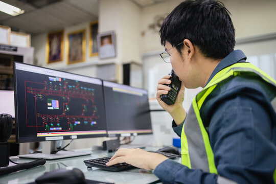 Engineer monitoring SCADA system in control room and documents, analyzing power grid operations on dual screens, energy management, automation, smart grid, and system supervision Concept