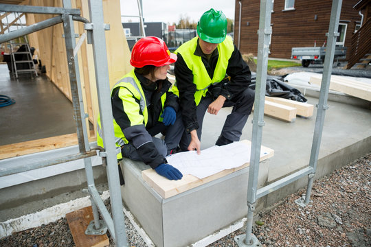 Carpenters With Plan Sitting At Construction Site