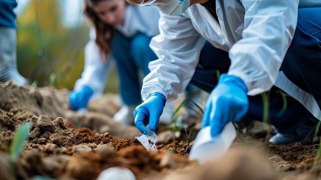 A forensic team of detectives and experts examining a crime scene, collecting evidence, and analyzing soil and other proof in a homicide investigation