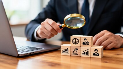 Businessman examining wooden blocks with icons