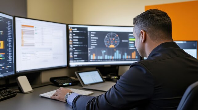 A cybersecurity expert reviewing threat analysis data on a digital dashboard, control room with real-time threat detection systems and network data, High-tech style