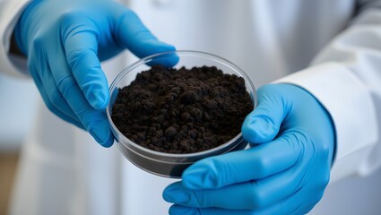 Laboratory examination of a dark soil sample held carefully in blue nitrile gloves by a scientist. The soils texture and color are key aspects of the analysis.