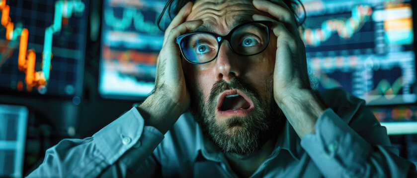 Stressed financial analyst with currency board in office background