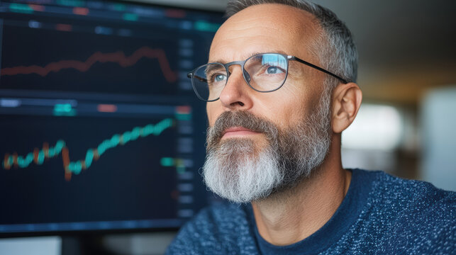 Businessman reviewing sales data on multiple computer screens in modern office. Analyzes business growth trends. Sits at desk focused on financial information. Modern office environment. Analyzing